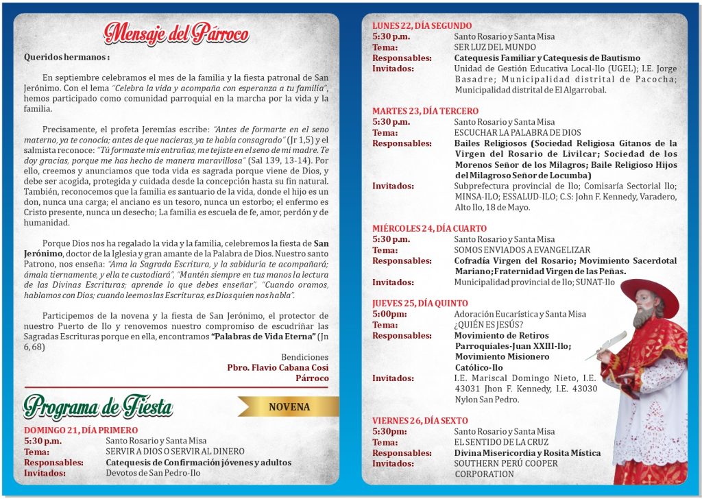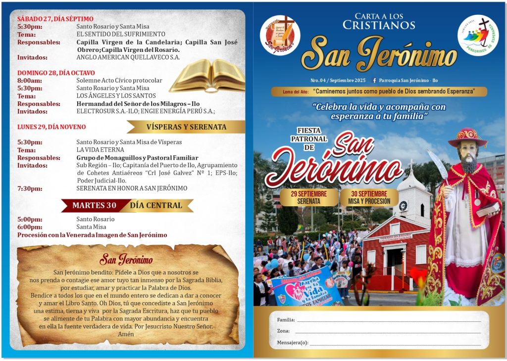 La comunidad parroquial de San Jerónimo del sector Ilo de la Diócesis de Tacna y Moquegua, se une con fervor para celebrar la fiesta patronal en honor a su santo patrono «San Jerónimo», doctor de la Iglesia y gran amante de la Palabra de Dios.
