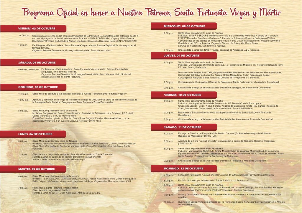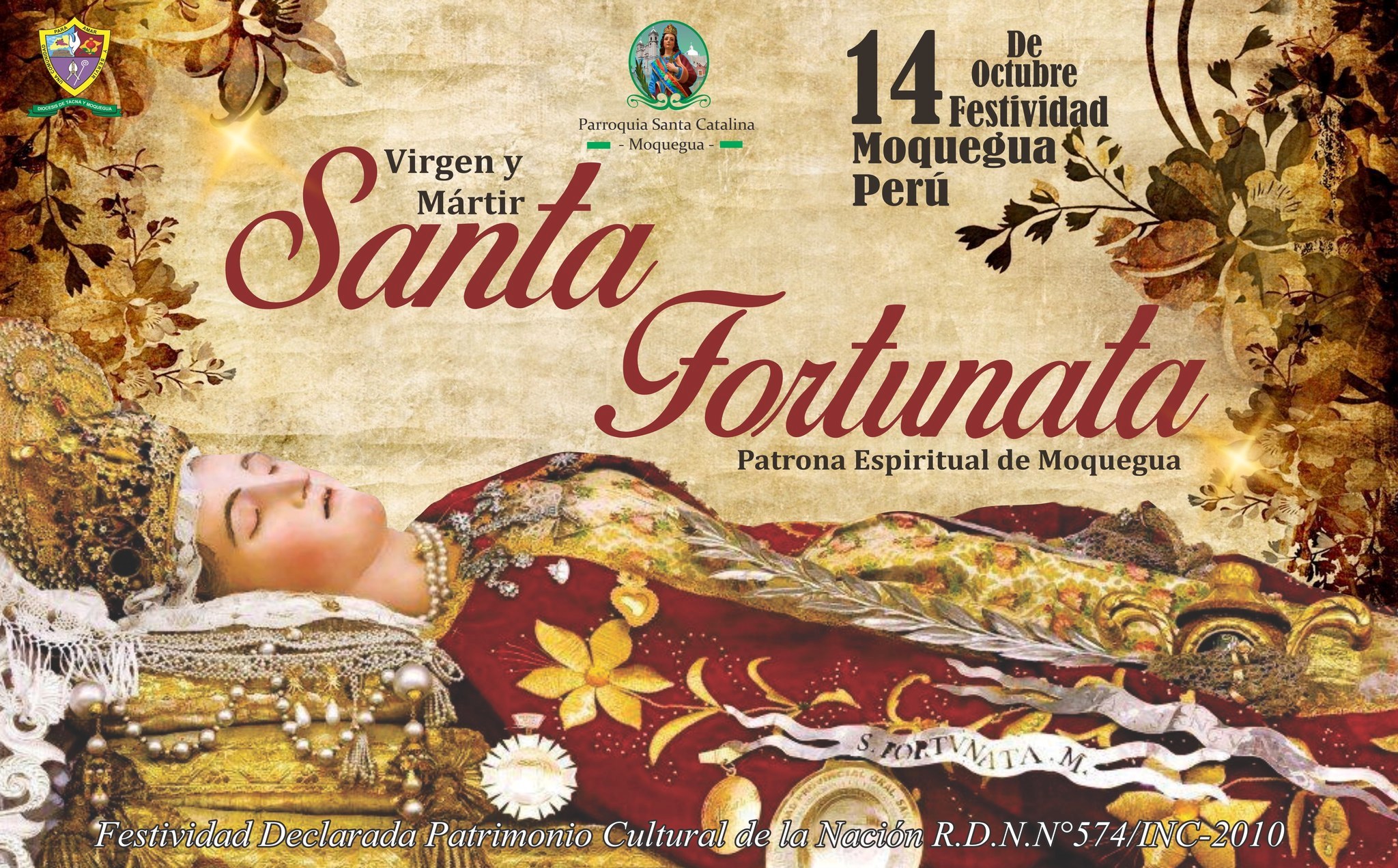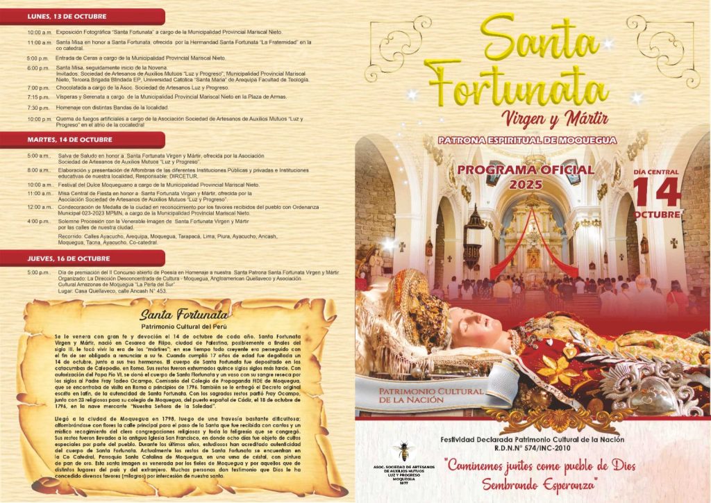 Con gran fervor religioso, la comunidad moqueguana se prepara para celebrar este 14 de octubre la Festividad de Santa Fortunata, Virgen y Mártir, reconocida como Patrona Espiritual de Moquegua.